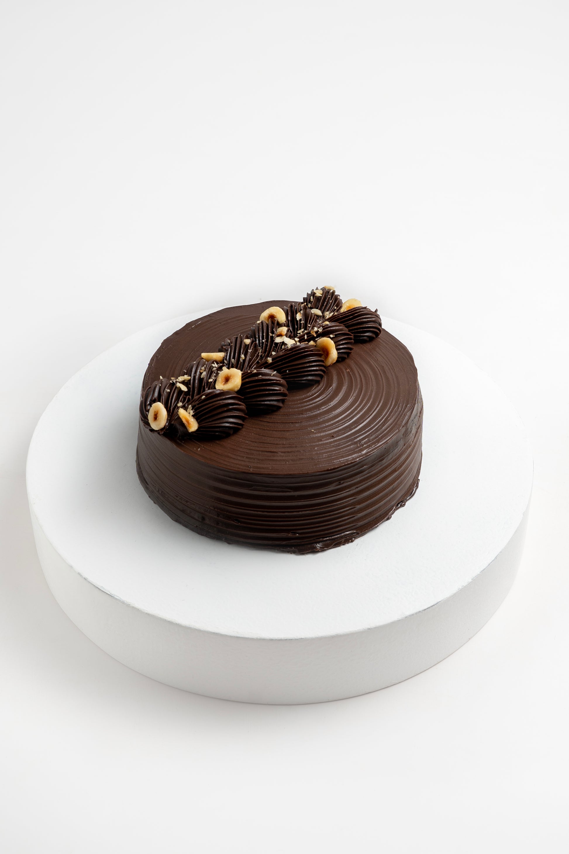 Layers of rich chocolate sponge, centre filled with hazelnut butter, dark chocolate ganache and hazelnut praline