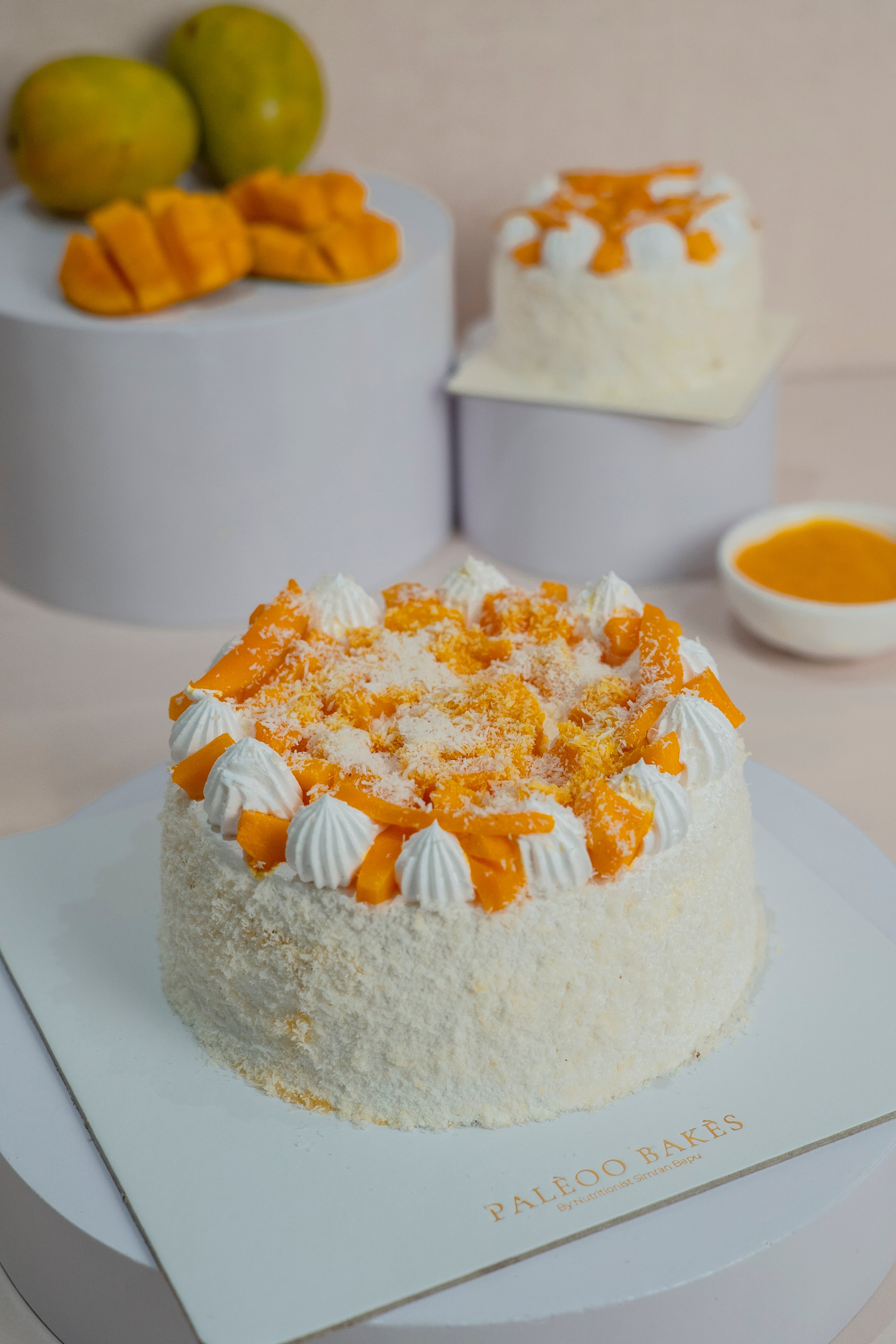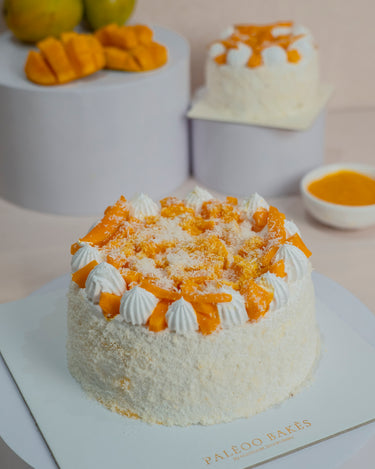 Fluffy mango sponge infused with the natural sweetness of ripe mangoes, layered with a silky coconut ganache that adds a creamy, mellow depth. Topped with fresh, juicy mango pieces and lightly toasted coconut flakes, this cake is a perfect balance of fruity brightness and tropical richness. Sugar & Gluten free