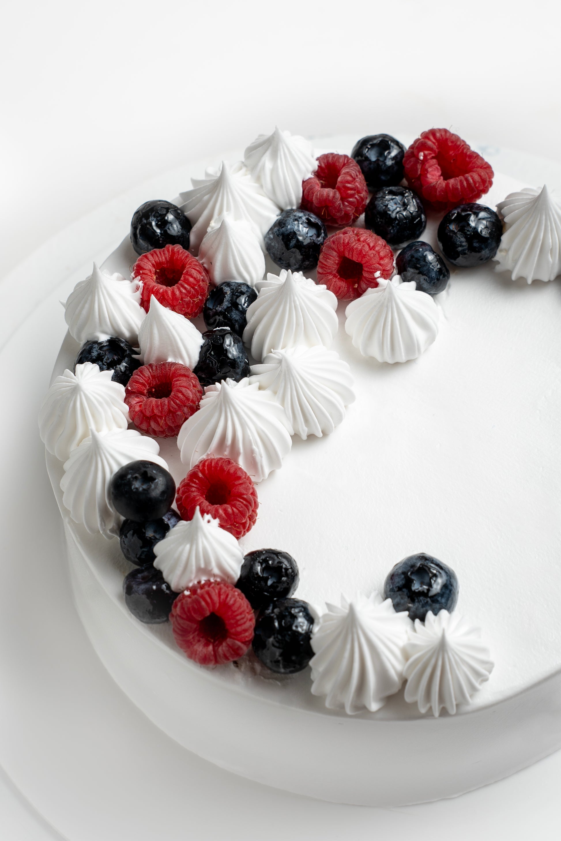 Vanilla sponge layered with coconut cream and filled with fresh raspberries and blueberries.