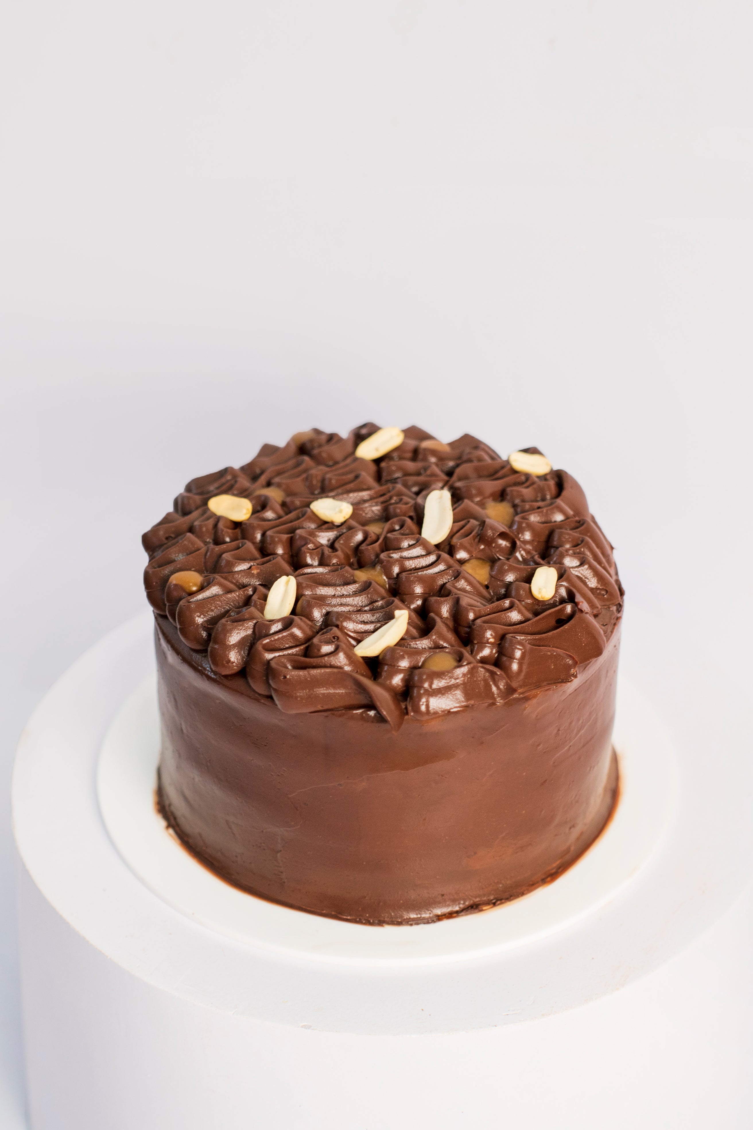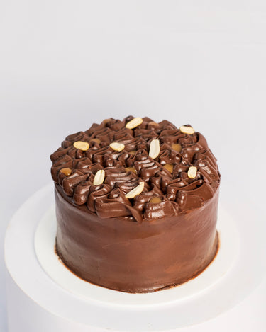 Rich almond chocolate sponge layered with dark chocolate ganache, sugar-free caramel, and caramelised peanuts for a decadent Snickers-inspired indulgence.